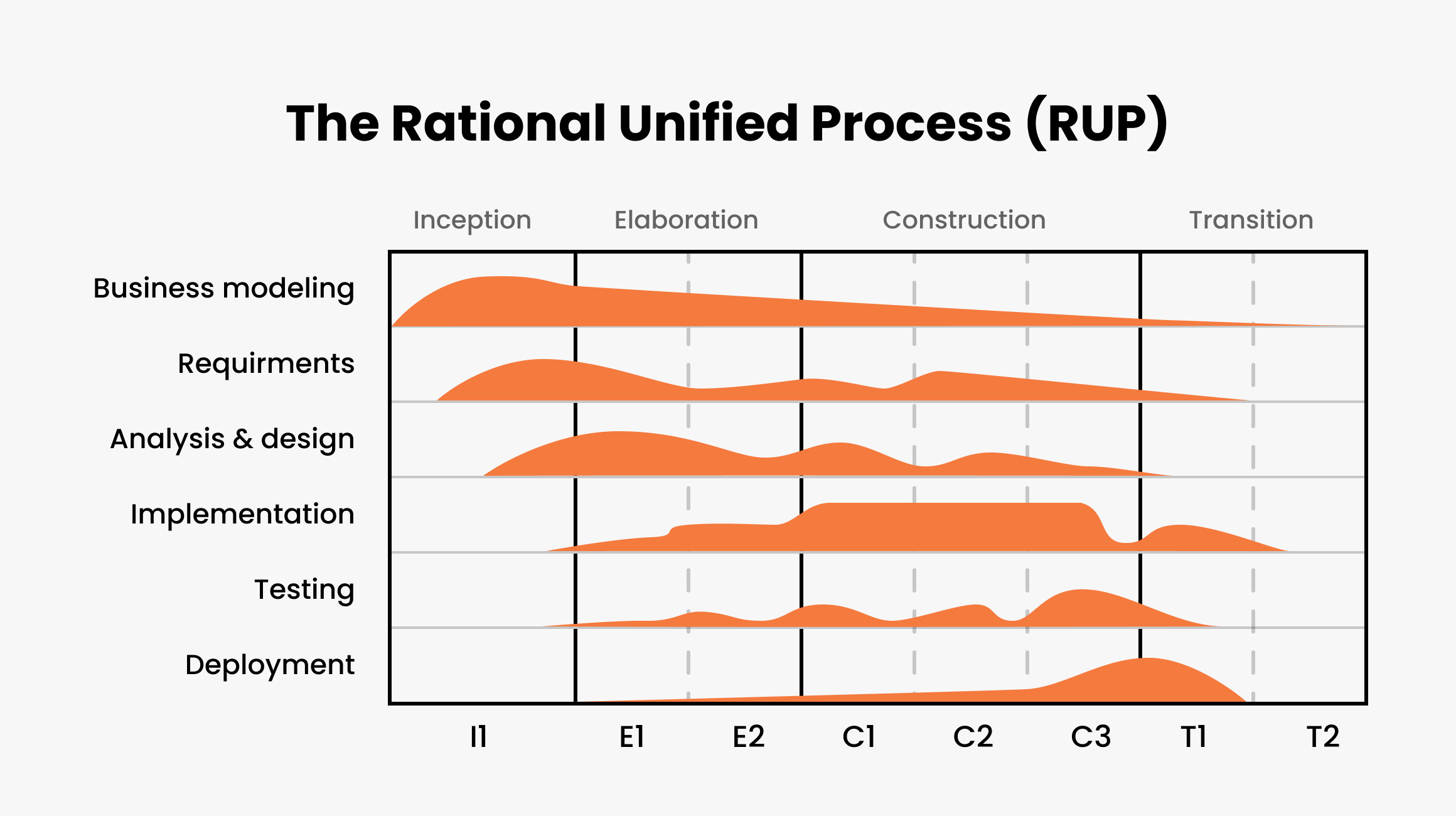 It’s a combination of linear (Waterfall) and iterative (Agile) approaches. The development is divided into four stages—inception, elaboration, construction, and transition. These make the linear part of the framework, and iterations happen within the limits of one stage. The core processes like UX/UI design and testing appear throughout all stages but with different levels of intensity.
