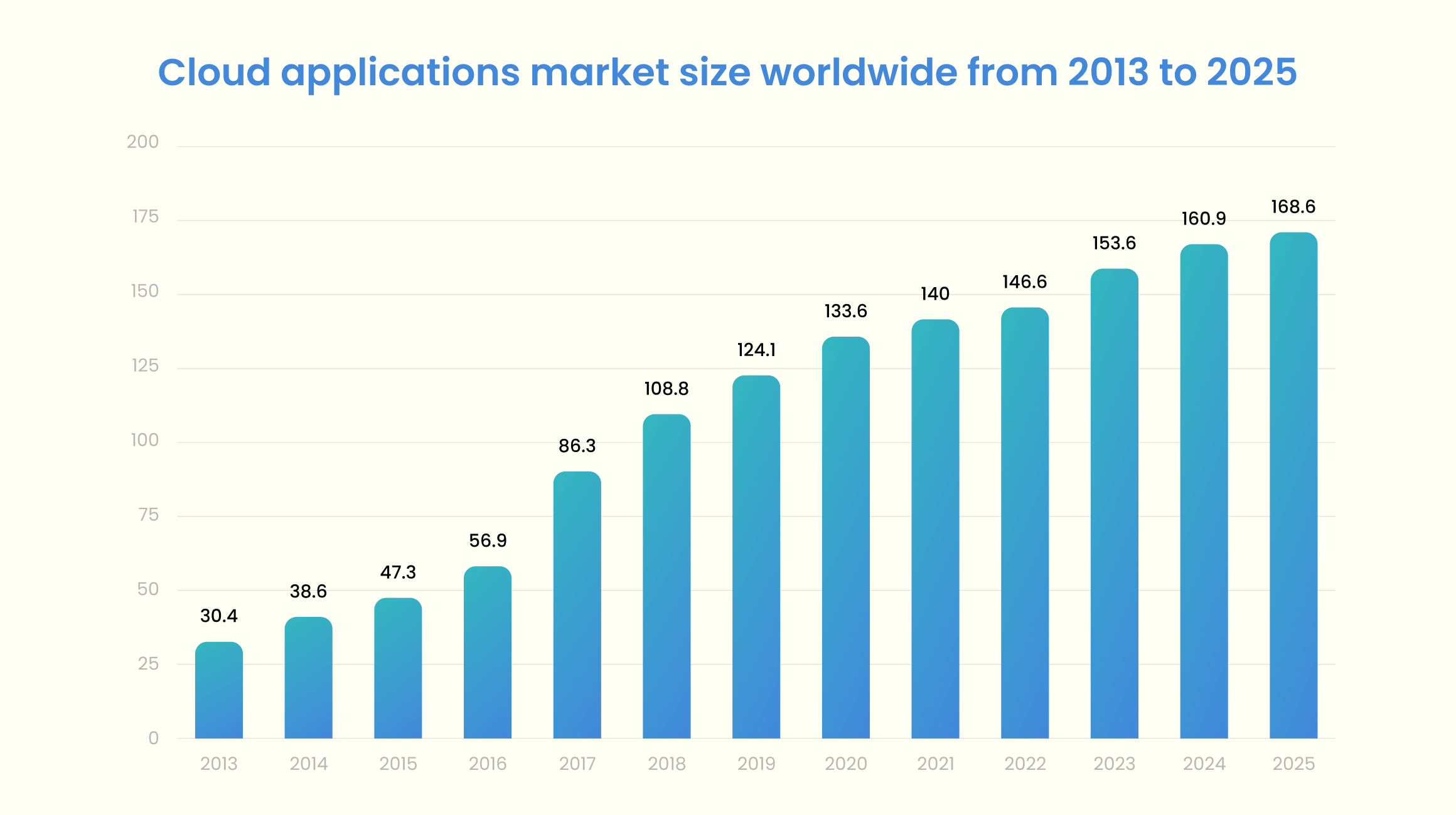 Statista predicts the total size of the cloud Software as a Service worldwide market to reach $166.8 B by 2024.