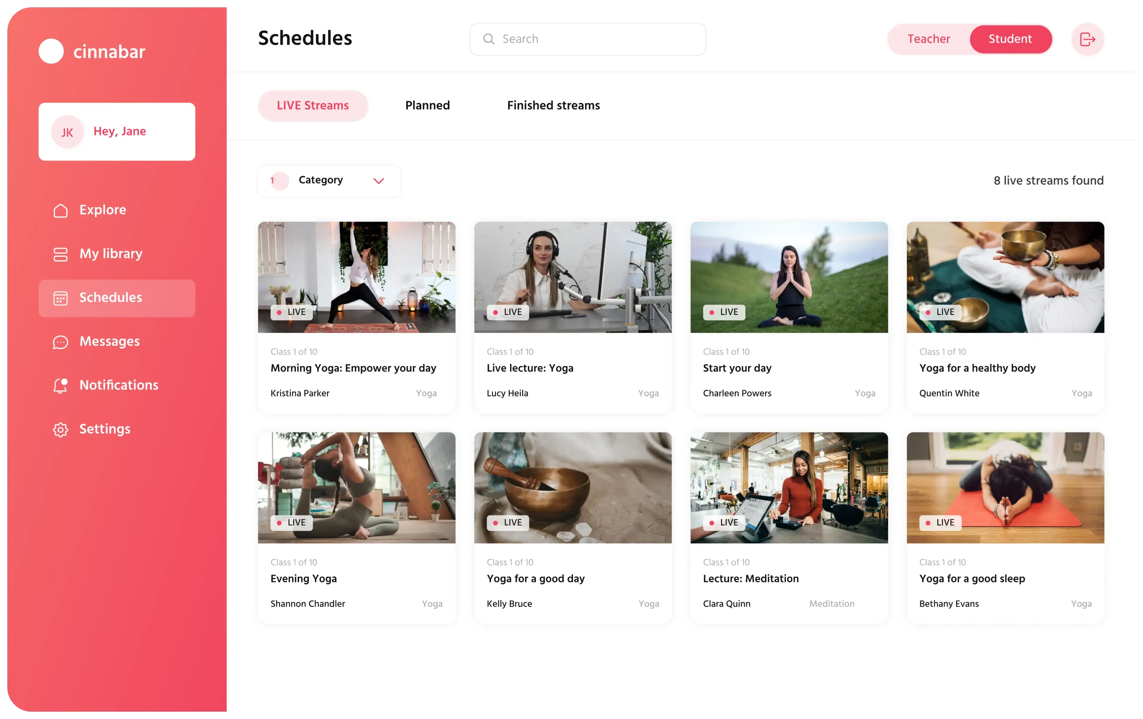 A user can join the platform as a teacher to share their knowledge with others or as a student to watch classes and learn. One person can have both types of accounts.
