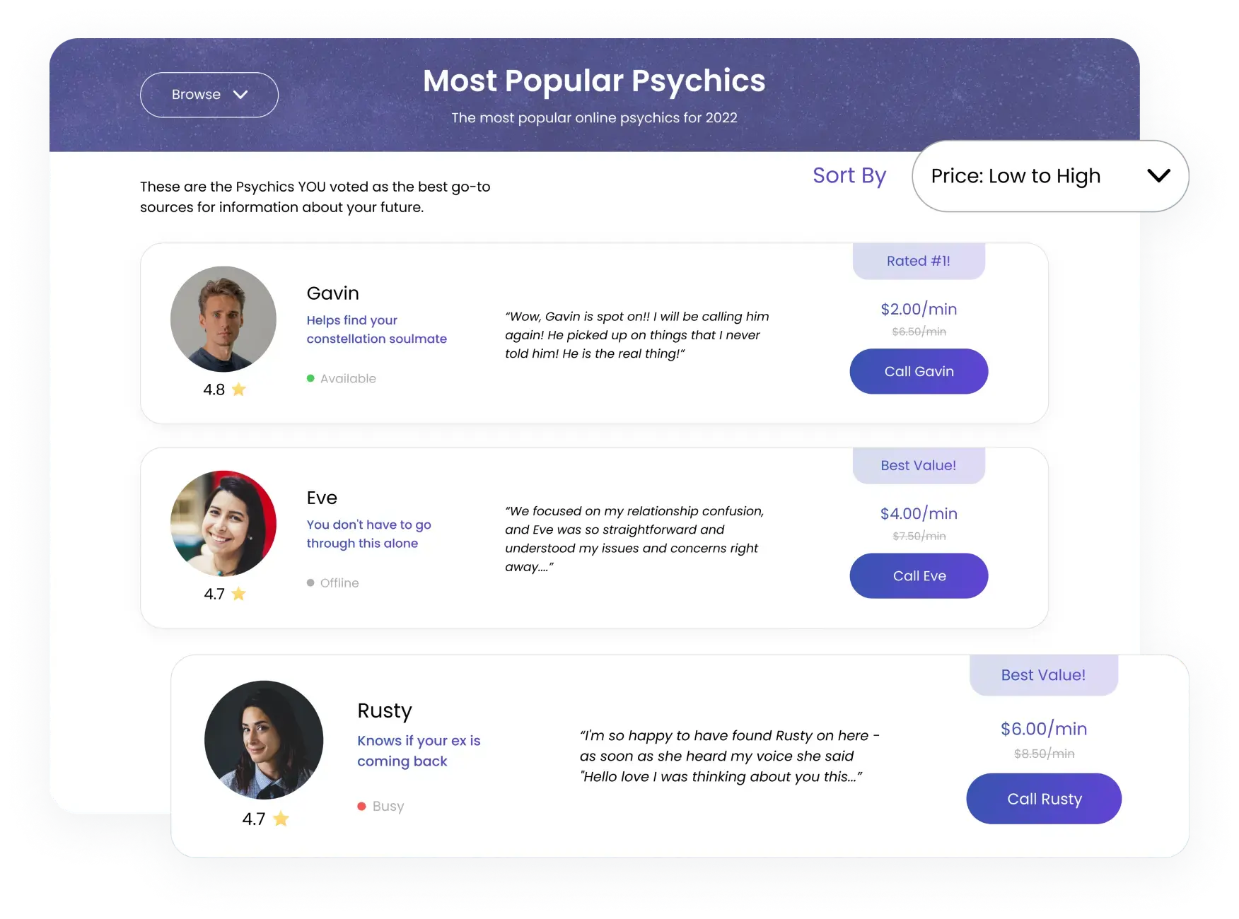 Each psychic has a profile with a short bio, main areas they work with, reviews, price, and availability status (available, busy, and offline).